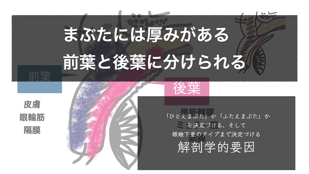前葉(anterior lamella)は、皮膚と眼輪筋と隔膜後葉(posterior lamella)は瞼板、眼瞼挙筋、ミュラー筋、瞼結が含まれます。