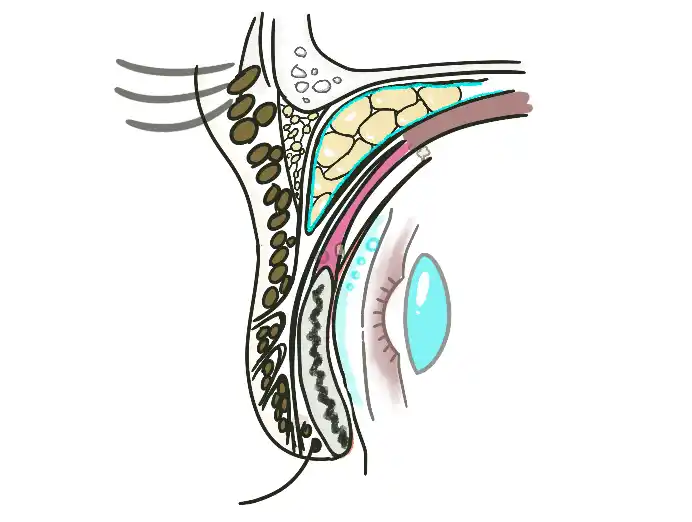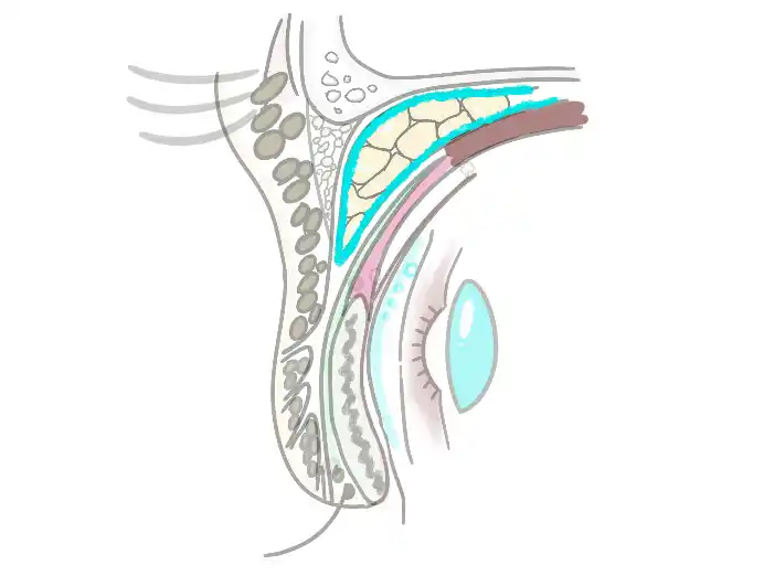 前層が「腱膜前の脂肪」と「まぶた前葉」を牽引する